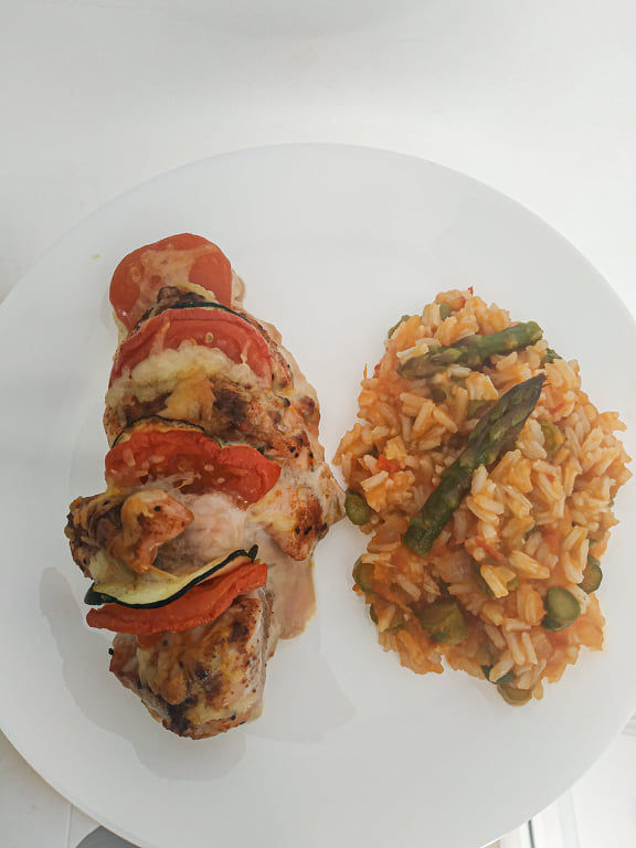 Colocar uma fatia de tomate e outra de courgette nos cortes do frango